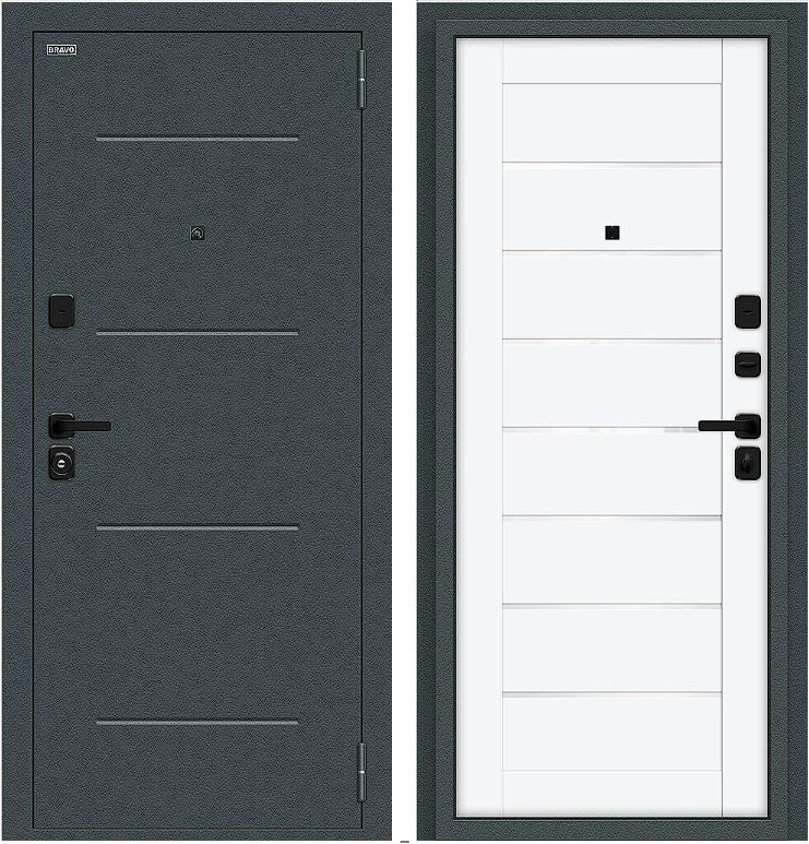 Надежная входная Дверь Браво Техно/SBlack Старк антрацит/White Silk премиум класса по цене 34 801 руб. Большая толщина стали защитит от проникновения в ваш дом, квартиру или коттедж. Используется очень качественная фурнитура: замки, цилиндры, ручки, защелки. Покрытие и отделка двери изготовлено под внимательным контролем производителя. Дверь имеет долгий срок службы и гарантию.